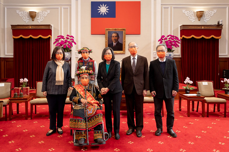 訪賓一行由「台灣無障礙協會」榮譽理事長林俊福帶領,衛生福利部部長薛瑞元、立法委員管碧玲陪同,前來總統府晉見總統,總統府秘書長李大維也在座。