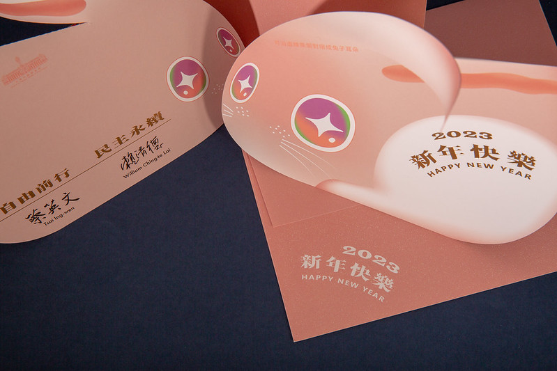 總統府公共事務室主任兼發言人高遵表示,本次設計兩款賀年卡,第一款為「總統、副總統聯名款」,設計師陳青琳以生肖為題,設計可愛圓潤的兔子造型卡片,閃爍星光的眼睛傳達堅定信心,兔耳則採撕縫線的設計,並搭配「自由前行 民主永續」文案與「2023新年快樂Happy New Year」,除祝賀新歲外,也傳達我們對於民主、自由的重視與期許。