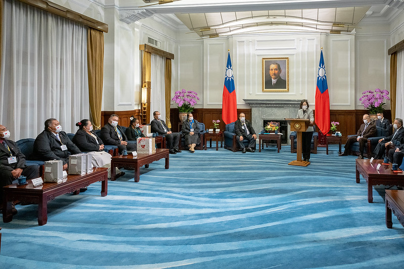 蔡英文總統今(9)日上午接見吐瓦魯國國會議長戴伊歐(Samuelu Penitala Teo)閣下伉儷訪團,感謝吐瓦魯政府跟國會,長期以來以行動表達對臺灣堅定的支持。新的一年,面對疫後經濟復甦、氣候變遷等國際挑戰,臺灣和吐瓦魯一定會一起努力,促進兩國永續發展,並為全球的進步繁榮做出更多貢獻。