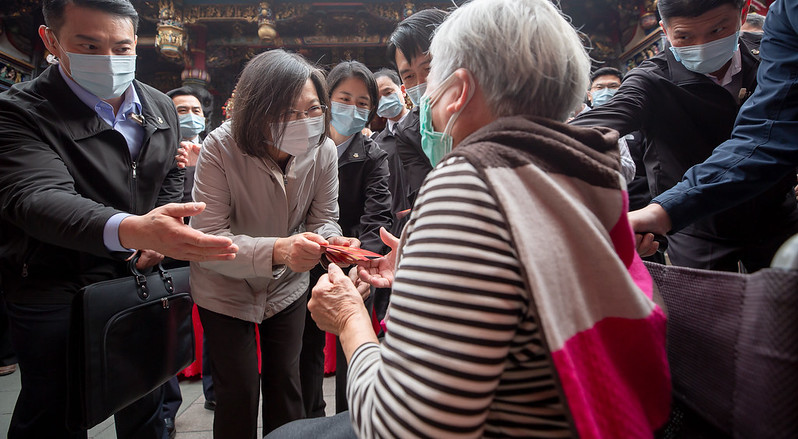 今(23)日是農曆大年初二,蔡英文總統下午前往台灣電力公司台中區營業處及陸軍裝甲第586旅聯兵三營,慰勉辛苦值班的台電同仁,肯定國軍的訓練成果,並感謝他們的辛勞付出。隨後至臺中市「豐原慈濟宮」祈福參香,發送兔年新春福袋向民眾賀年。