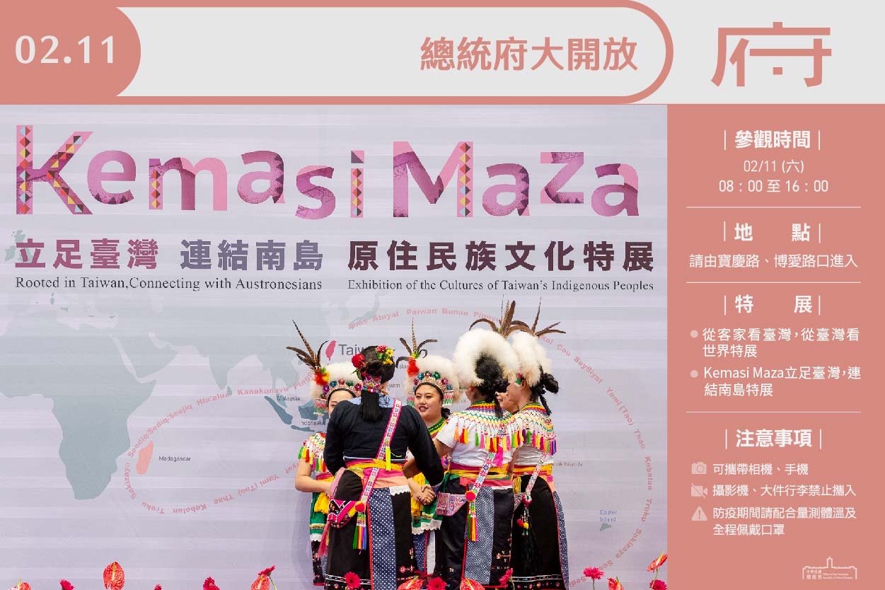 總統府2月11日(週六)上午8時至下午4時開放參觀,開放區域為總統府一至三樓,包括敞廳、大禮堂、常設展「府-建構」、「府-日常」、「府-聲音」、「府-遇見」、「府-時代」、「府-想像」、「從客家看臺灣,從臺灣看世界特展」、「府-印象」、「Kemasi Maza立足台灣,連結南島特展」及「府-我在」、郵局、交誼廳、紀念品中心及北苑庭園。