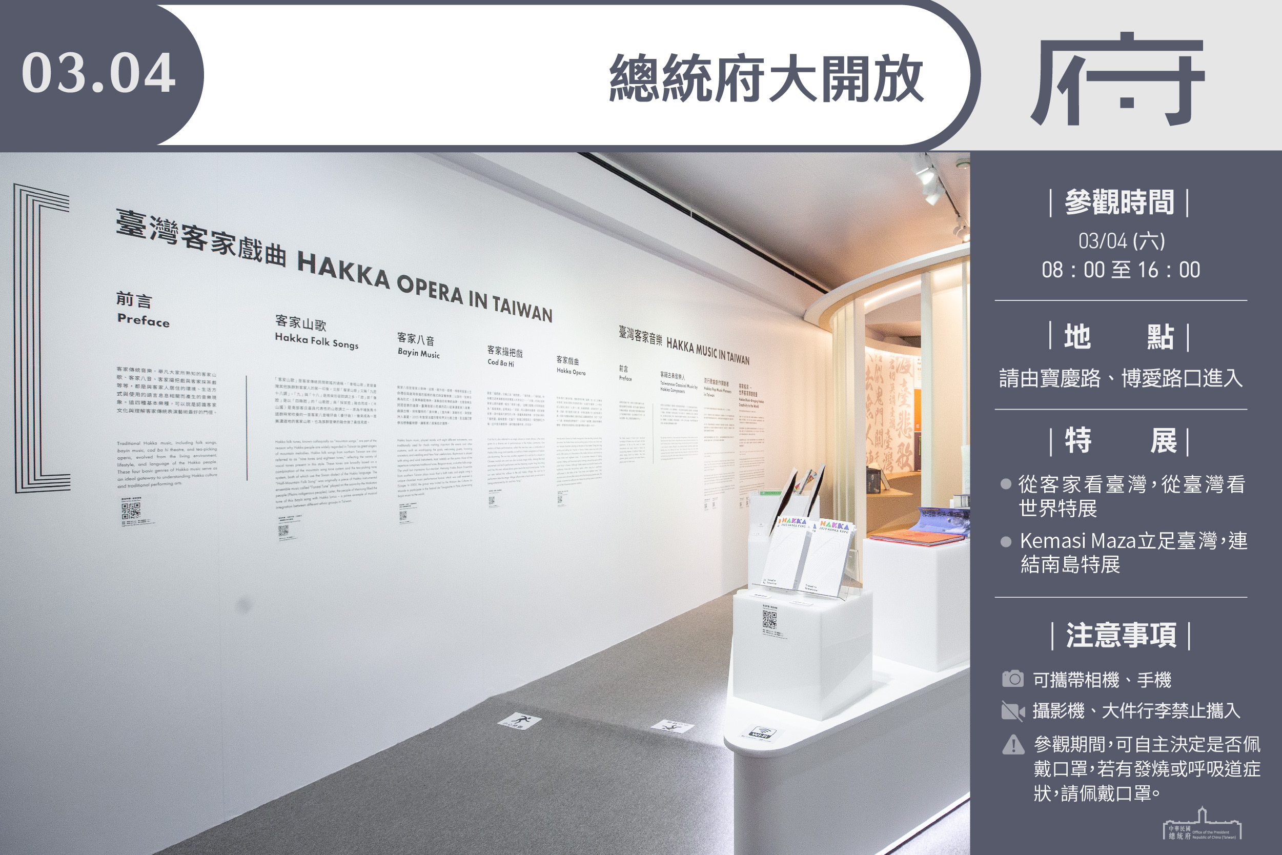 總統府3月4日(週六)上午8時至下午4時開放參觀,開放區域為總統府一至三樓,包括敞廳、大禮堂、常設展「府-建構」、「府-日常」、「府-聲音」、「府-遇見」、「府-時代」、「府-想像」、「從客家看臺灣,從臺灣看世界特展」、「府-印象」、「Kemasi Maza立足台灣,連結南島特展」及「府-我在」、郵局、交誼廳、紀念品中心及北苑庭園。