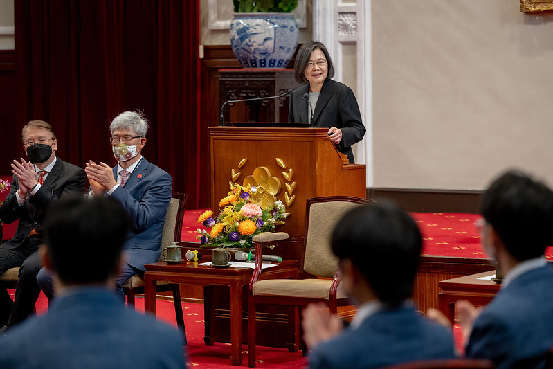 總統致詞時表示,在2020年到2022年間,國際數理學科奧林匹亞競賽,臺灣學生一共有140人次參賽,總共獲得52面金牌、46面銀牌、28面銅牌及14面榮譽獎。這樣的成績非常不容易,她特別感謝老師及同學們共同投入的努力。代表團在國際競賽當中,展現出優異的分析跟思考能力,也為臺灣贏得許多榮耀,「各位都是我們的臺灣之光」。