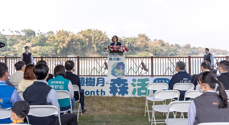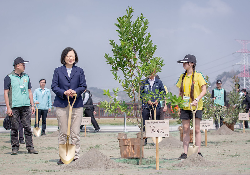 隨後,總統種下臺灣原生樹苗、覆土與澆水,並期盼大家一起繼續努力,一起邁向永續的臺灣。包括行政院長陳建仁、秘書長李孟諺、政務委員羅秉成、農業委員會主任委員陳吉仲,及立法委員羅美玲、立委當選人蔡培慧等亦出席是項活動。