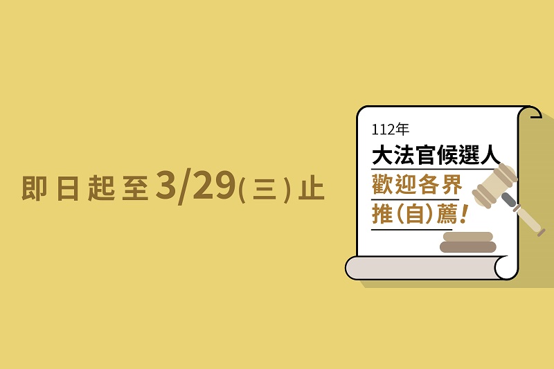 112年司法院大法官提名審薦小組公開接受各界推(自)薦即將於3月29日(星期三)截止,審薦小組籲請社會各界把握最後幾天時間,踴躍推薦或自我推薦,為國家社會貢獻心力。