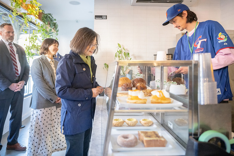 隨後,總統步行前往「Win Son Bakery盈成烘焙坊」,聽取創辦人之一、臺美青年Josh Ku介紹店內特色餐點,總統也親自點餐並現場品嚐飯糰、甜甜圈等臺式餐點。