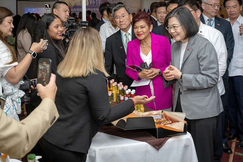 隨後,總統接受貝里斯婦女受益戶代表致贈紀念品,並在貝國外交部次長艾蜜麗亞及國際合作發展基金會秘書長項恬毅的陪同下,參觀婦女受益戶成果攤位,瞭解我協助友邦改善婦女族群經濟賦權及學習資源等方面的成果。
