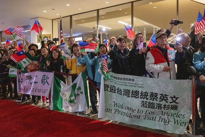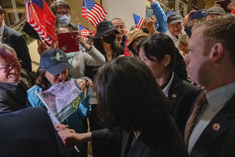 專機停妥後,我國駐美國代表處大使蕭美琴及「美國在台協會」(AIT)主席羅森柏格(Laura Rosenberger)登機歡迎總統,駐洛杉磯辦事處總領事紀欽耀則於機梯旁迎接。隨後,總統一行驅車前往下榻旅館,在旅館前受到僑胞熱烈歡迎。