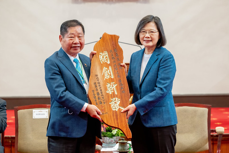 總統致詞時首先歡迎訪賓來到總統府。新北市進出口商業同業公會是國內很具規模的進出口公會,涵蓋各領域的優秀廠商,從紡織、印刷等傳統產業,到科技、資通訊、以及生技醫材等,類型非常多元,會員朋友們都對臺灣的外貿及經濟發展有許多貢獻。