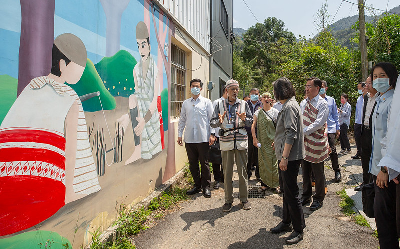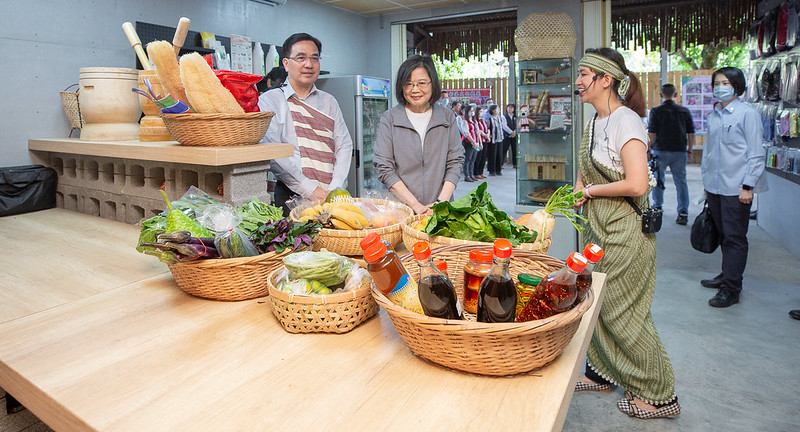 最後,總統也在泰好玩文化事業公司負責人賴淑娟介紹下,瞭解「泰好玩獵人體驗營遊程」、織布、藤編、口簧琴等3項傳統工藝,以及五葉松汁、在地農產、織布文創商品等部落特產,並欣賞迎賓打擊表演。