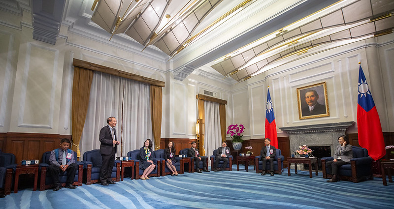 訪賓一行由數位發展部部長唐鳳陪同,前來總統府晉見總統,總統府秘書長林佳龍也在座。
