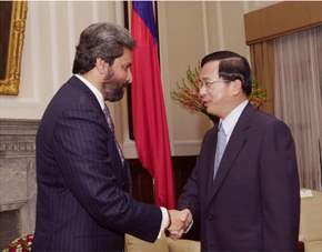 陳總統水扁先生今天接見「千禧年聯合國世界宗教與精神領袖和平高峰會」秘書長巴瓦金(Bawa Jain)及副主席丁娜(Dena Merriam),對他們為促進宗教與世界和平以及推動心靈環保來華訪問,表達歡迎與感謝之意。