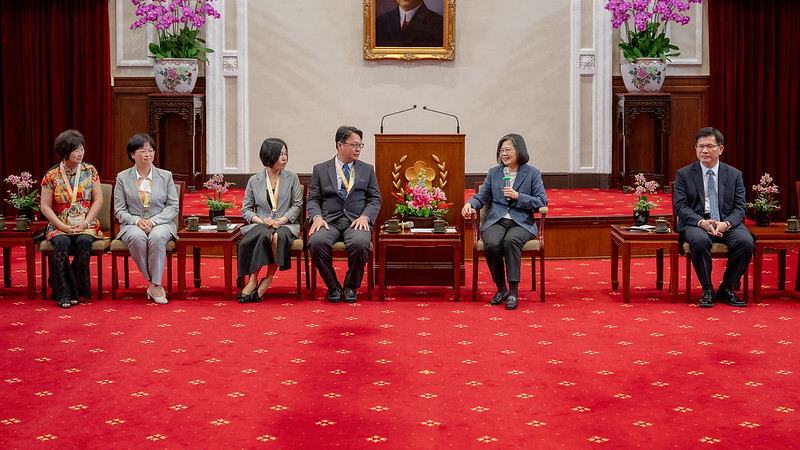 總統提到,2050淨零轉型是政府的重要政策目標。她也要感謝今年有好幾位得獎者,致力促進低碳材料、製程的研究,也推動綠能科技的進展;還有許多從事公共設施行業的朋友,包括供水、供電、電信、公共運輸。她感謝大家用專業及經驗,讓我們的供應系統穩定運作,也為社會帶來安定的力量。