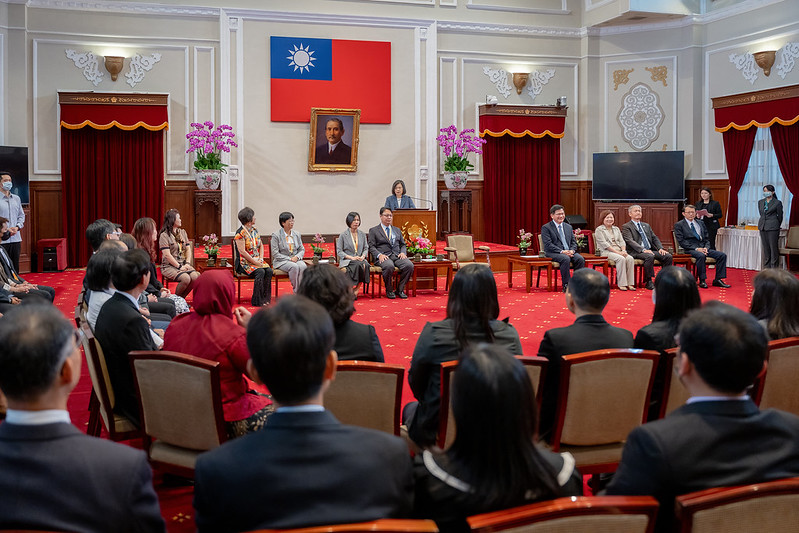 訪賓一行由勞動部長許銘春陪同,前來總統府晉見總統,總統府秘書長林佳龍也在座