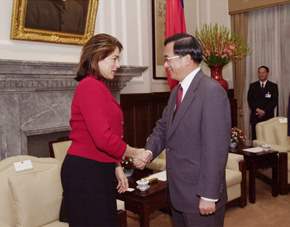 陳總統水扁先生今天下午在總統府接見美國聯邦眾議員桑潔絲(Loretta Sanchez),並代表中華民國政府與人民對她的遠道來訪表示歡迎。