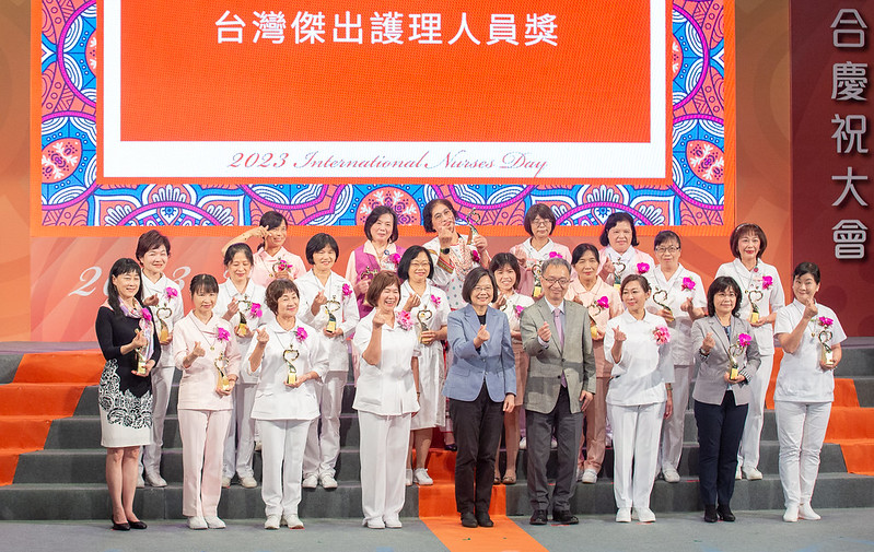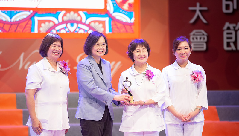 隨後,總統親頒「台灣傑出護理人員獎」—專業貢獻獎、服務奉獻獎以及「臺灣護理先驅-周美玉女士薪傳獎」,表彰得獎者提昇全民健康之具體貢獻。
