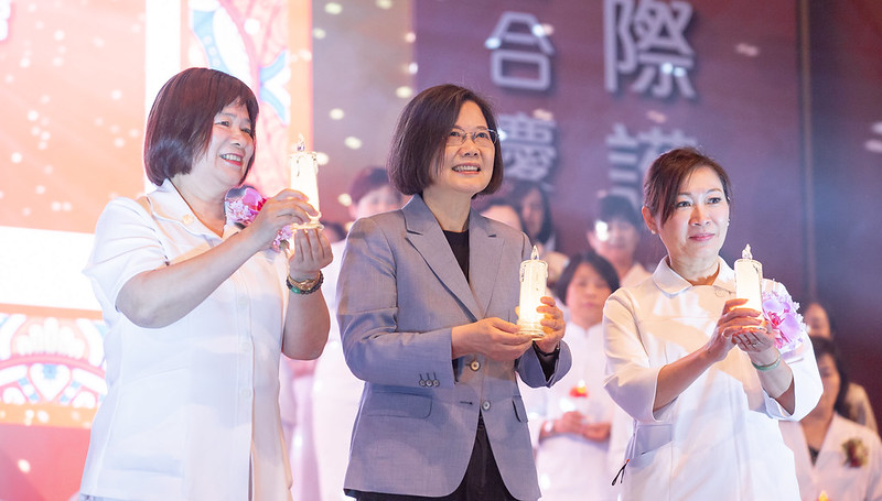 總統致詞時表示,稍早的傳光儀式讓她非常感動,感謝護理人員這幾年來對民眾的照顧,讓我們一起度過難關。明天是「國際護師節」,很高興今天能和大家一起參加慶祝大會,也預祝全國護理人員「護師節快樂」。她要恭喜獲獎的傑出護理人員,感謝他們在不同崗位上,秉持對護理的專業、堅持以及照顧人民的心,一直守護著臺灣民眾的健康。