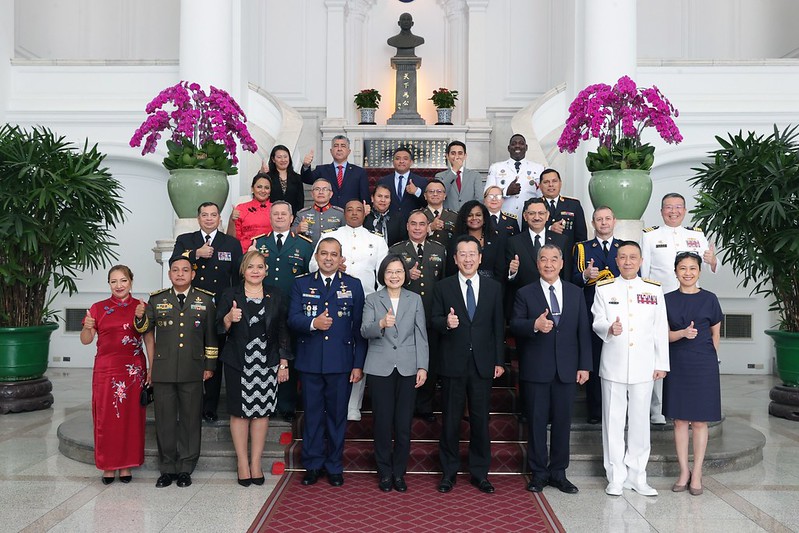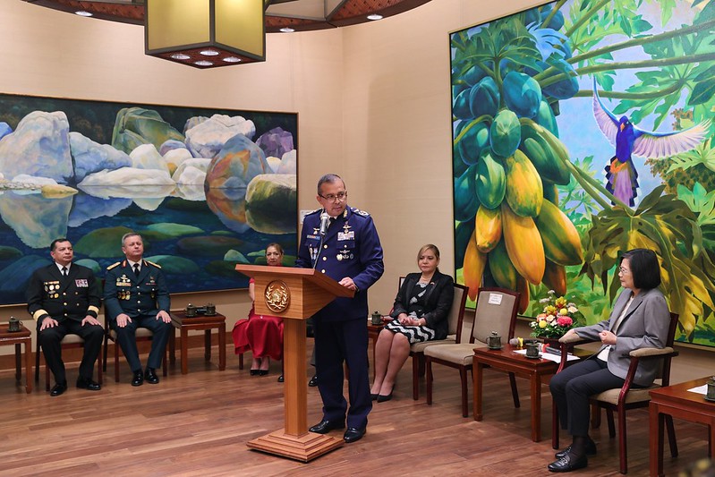 訪賓一行由國防部長邱國正、國防大學校長劉志斌、貝里斯駐臺大使碧坎蒂(Candice Pitts)、瓜地馬拉駐臺大使巴迪亞(Oscar Adolfo Padilla Lam)陪同,前來總統府晉見總統,國家安全會議秘書長顧立雄也在座。