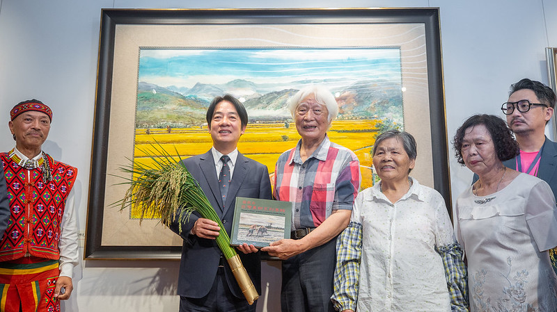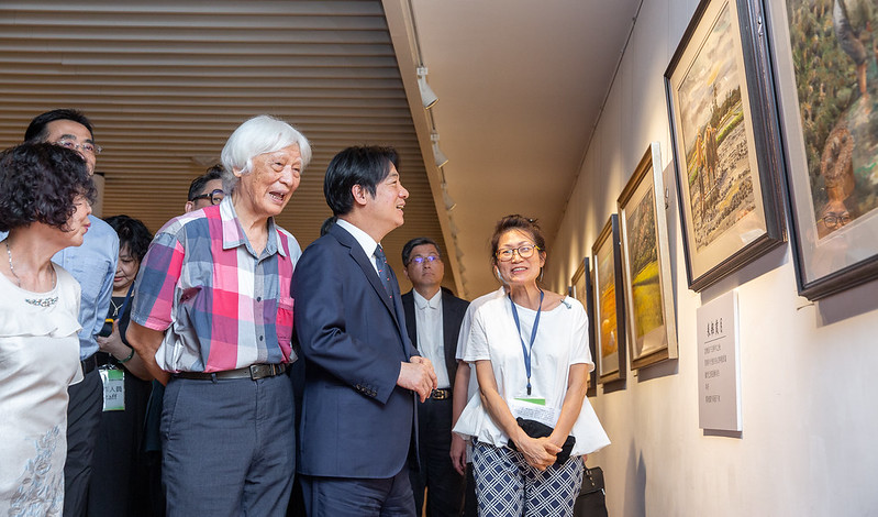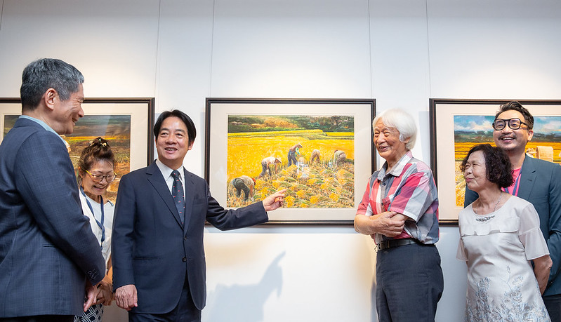 賴清德副總統今(1)日下午參觀「張秋臺86水彩畫展」。副總統在畫家張秋臺陪同下,仔細感受畫作的濃郁鄉土情懷及臺灣百年田園風華,也聆聽原住民歌手南賢天演唱卑南族歌謠《美麗的稻穗》,與現場民眾共享這場視覺及聽覺的藝術饗宴。