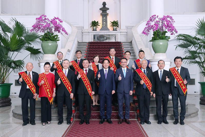 訪賓一行包括總統府國策顧問暨大洛杉磯臺灣會館董事長田詒鴻、總統府國策顧問暨大洛杉磯臺灣會館執行長林榮松、休士頓臺灣傳統基金會暨休士頓臺灣人活動中心理事暨行政院政務顧問宋明麗、大洛杉磯臺灣會館秘書長暨行政院政務顧問吳兆峯、紐約臺灣會館理事賴弘典、華府臺灣文化中心理事長黃泰郎、聖地牙哥臺美基金會執行長歐春美、北加州臺灣會館理事長廖俊惠、臺加文化協會理事長蔡雅玲等,由僑委會徐佳青委員長陪同,前來總統府晉見總統,總統府秘書長潘孟安也在座。