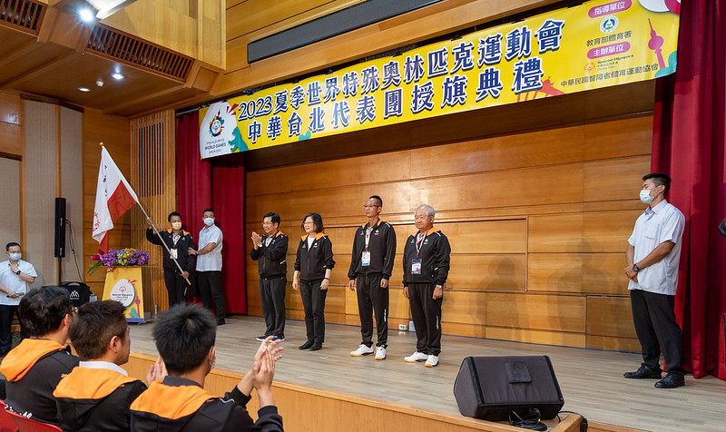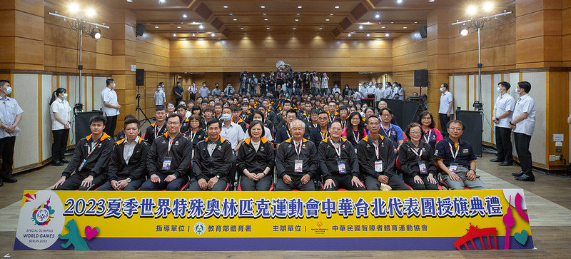 蔡英文總統今(10)日下午出席「2023年夏季世界特殊奧林匹克運動會代表團授旗典禮」,親授國旗及團旗給代表團,為即將出征的教練及選手們加油打氣。並表示,臺灣選手們能站上國際舞台,除了選手的努力,教練、融合夥伴、志工們的陪伴和貢獻也是關鍵。她祝福選手們在特奧的舞台上享受運動樂趣,突破自我、奪得佳績。