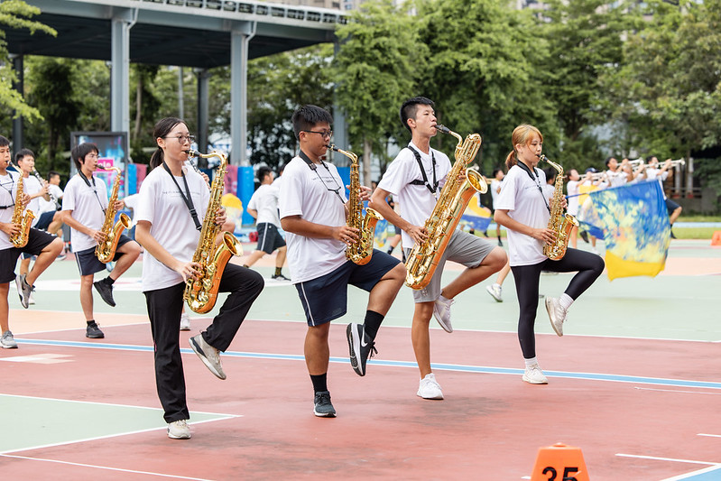 副總統抵達後,首先欣賞建中樂旗聯隊精彩演出。隨後致詞表示,看到同學們剛剛在太陽底下操練,滿身大汗,非常感動,也很榮幸可以看到大家完整的表演。後天,大家就要出國參加比賽,祝福大家一路平安、凱旋歸來。