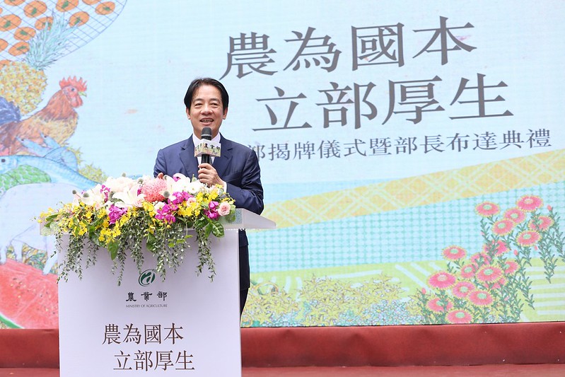 賴清德副總統今(1)日上午出席「農業部揭牌儀式暨農業部部長布達典禮」時表示,農業部要永遠做農漁民的靠山,讓臺灣農業永續發展,幫助農民、農業,以滿足國人生活糧食所需。並期勉陳吉仲部長任重道遠,未來率領農業部與相關團體共同合作,對農民、農業及國家做出更進一步的貢獻。