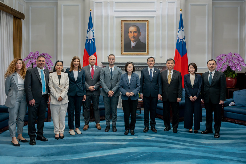 訪團成員尚包括以色列國會議員米爾維斯基(Hanoch Dov Milwidsky)、妮爾(Sharon Nir)、芙莉曼(Yasmin Fridman)、夏克林(Osher Shkalim)及以色列國會顧問暨友台小組主席辦公室幕僚長娜虹(Adi Nahum),由外交部次長李淳及駐以色列代表處公使李雅萍陪同,前來總統府晉見總統,總統府秘書長林佳龍也在座。