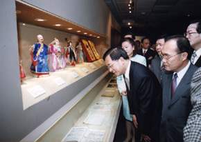 隨後,總統並在文建會陳郁秀主委的陪同下,前往國立歷史博物館四樓,參觀刻正展出的「八十九年行政院文化獎特展」,對於四位文化獎得獎人-布袋戲宗師黃海岱先生、台灣文學理論先驅葉石濤先生、世界宗教領袖聖嚴法師、中國文學研究翹楚王叔岷先生-之傑出表現和貢獻,總統也表示崇敬之意,並對於渠等展出的作品內容,輿趣盎然的仔細欣賞。