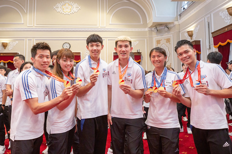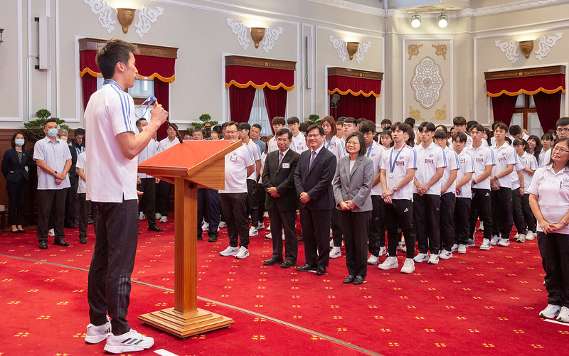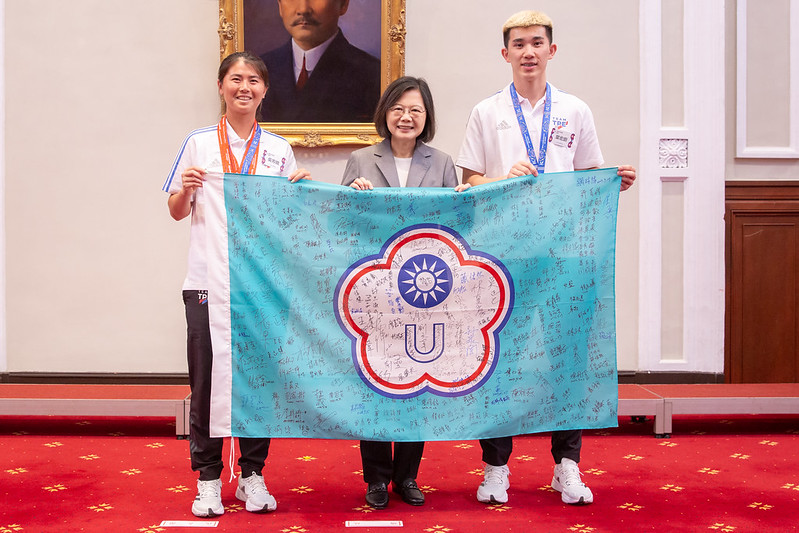 總統說,她要感謝各位選手,讓世界看見臺灣的體育實力。像是「鞍馬王子」—李智凱選手成功完成鞍馬項目的三連霸,跆拳道羅嘉翎選手以及「柔道男神」楊勇緯選手都獲得銀牌。不僅如此,代表團也寫下許多臺灣體壇的新紀錄。武術孫家閎選手第一次參加世大運,就為臺灣拿下首面金牌。田徑彭名揚選手不只贏得金牌,更打破長達22年的全國紀錄,確定進軍明年巴黎奧運。