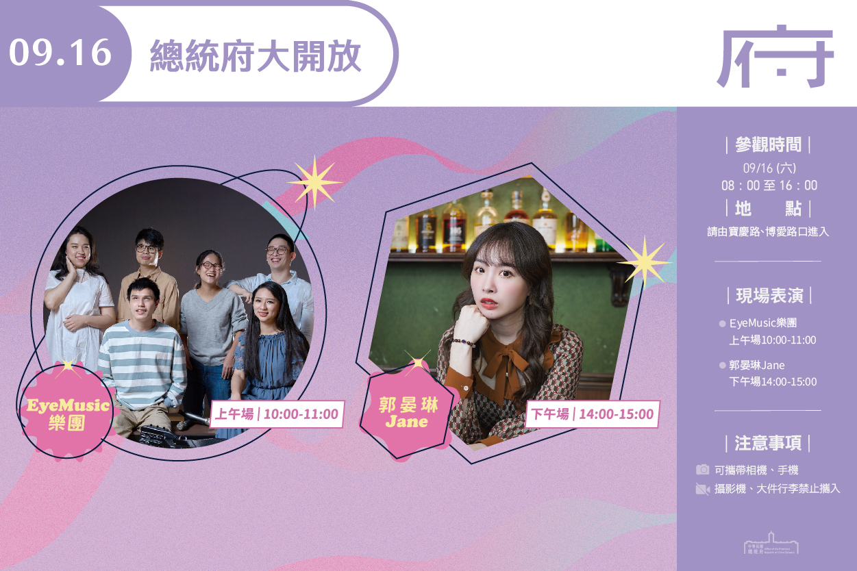 總統府9月16日(週六)上午8時至下午4時開放參觀,開放區域為總統府一至三樓,包括敞廳、大禮堂、常設展「府-建構」、「府-日常」、「府-聲音」、「府-遇見」、「府-時代」、「府-想像」、「從客家看臺灣,從臺灣看世界特展」、「府-印象」、「Kemasi Maza立足台灣,連結南島特展」、「府-我在」、郵局、交誼廳、紀念品中心及南、北苑庭園。