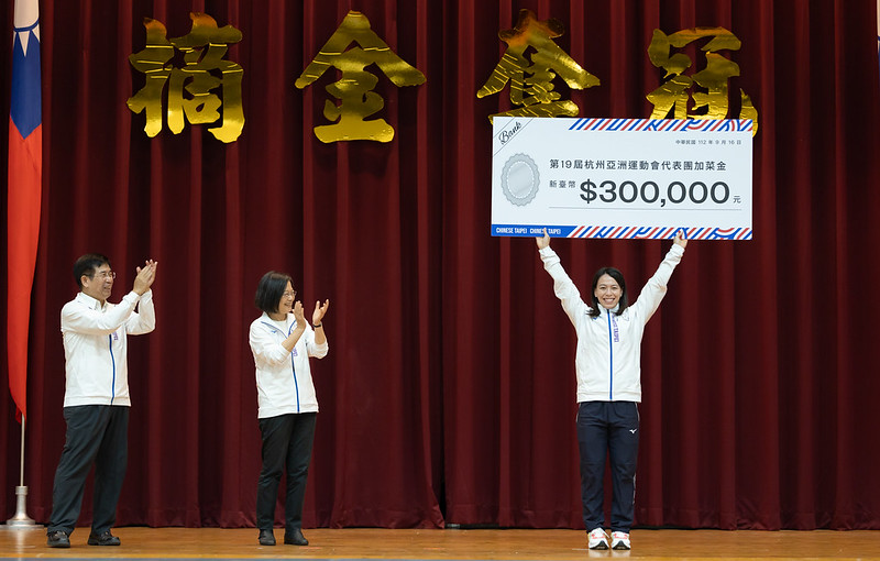總統抵達後,首先頒授國旗及團旗予我代表團,並致贈加菜金予選手代表。 隨後致詞時表示,下星期「第19屆杭州亞洲運動會」的代表團就要啟程出發,她今天很高興再次來到國訓中心,為選手、教練,加油打氣及授旗。