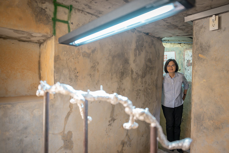 總統抵達南竿「山隴排練場」後,首先聽取連江縣政府文化處長吳曉雲簡介「收信快樂」作品之策展理念及過程,並欣賞該作品介紹影片;隨後,前往「26據點」,在總策畫吳漢中及建築師張正瑜解說導覽下,參觀「地下實驗室」。