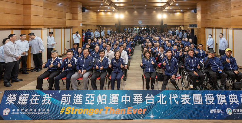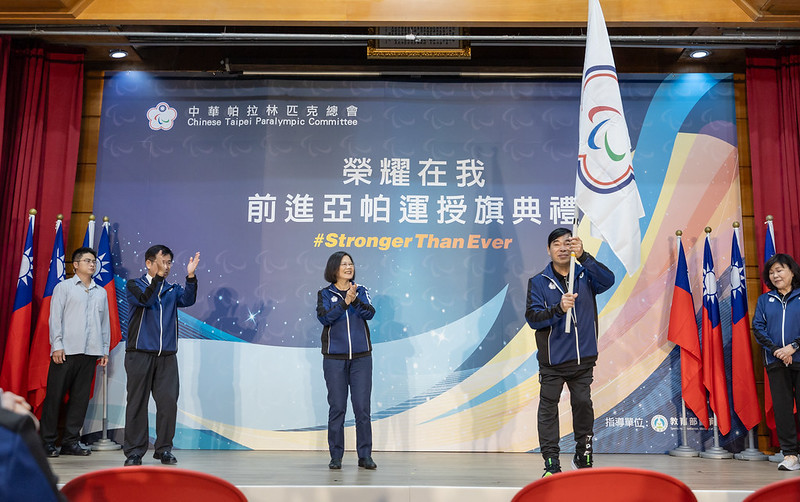 總統抵達後首先進行授旗儀式及頒發加菜金,隨後致詞時表示,本屆的杭州亞帕運將在10月22日舉行,代表團也即將出發,她很高興今天能夠親自為選手們加油、打氣。