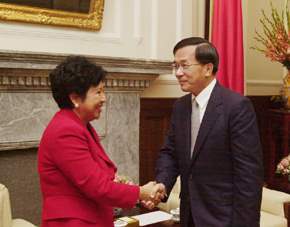 陳總統水扁先生今天下午在總統府接見國父孫中山先生孫女孫穗芳博士,並代表中華民國政府與人民對孫博士長期致力追求亞洲及海峽兩岸和平所付出的心力與貢獻,表示崇高的敬意與由衷的謝忱。