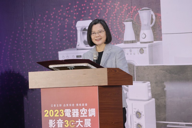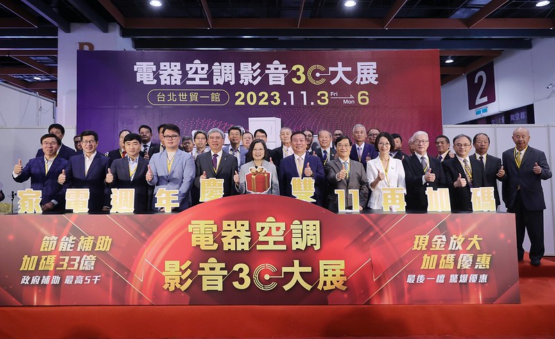 蔡英文總統今(3)日上午出席「2023電器空調影音3C大展開幕典禮」,邀請民眾一起來逛展及添購新家電。她感謝業界響應政府政策,積極研發更節能、省電的智慧電器,並呼籲民眾選用「能效分級1級或2級」產品,到2025年6月,政府都有提供貨物稅補助。此外,今年各家廠商為不同族群推出主題家電,歡迎國人利用活動期間好好挑選,拚買氣也為臺灣拚經濟。