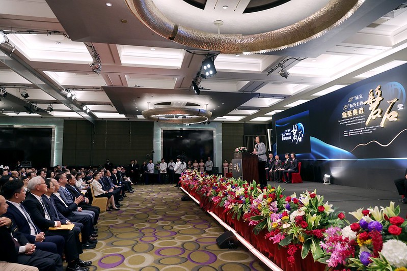 總統致詞時首先恭喜得獎企業獲得「國家磐石獎」和「海外台商磐石獎」,大家都是中小企業的典範,持續在不同的領域中保持卓越的表現,令人敬佩。她也要感謝所有企業朋友對臺灣經濟發展的付出,並感謝台商朋友在海外努力打拚,拓展臺灣企業的全球布局。