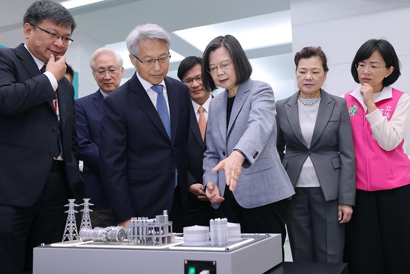 隨後,總統在經濟部王美花部長及中研院廖俊智院長等人陪同下,參觀去碳燃氫發電技術展示場。
