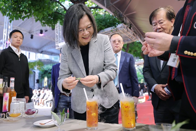 隨後,總統和現場貴賓一同欣賞來自臺東卑南族的創作歌手高偉勛演唱歌曲,並至茶點區參觀,也親自體驗製作創意分子料理「芒果莫西多附水果晶球」及創意料理「肉夾饃」。