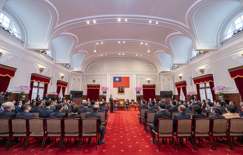 訪賓一行由「中華民國國家企業競爭力發展協會」主任委員、立法委員鍾佳濱率領,內政部次長吳堂安、經濟部主任秘書楊志清陪同,前來總統府晉見總統,總統府秘書長林佳龍也在座。