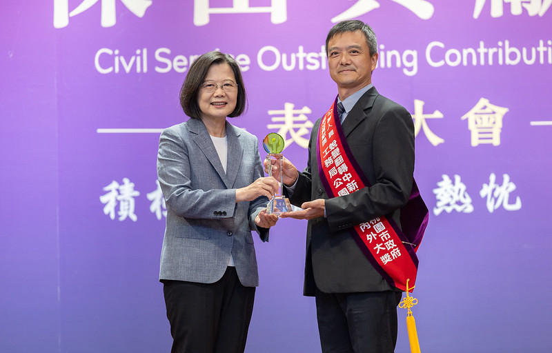 隨後,總統親自頒發「公務人員傑出貢獻獎」予得獎者及團體代表,表彰他們在工作領域上的優異表現,以及為民服務的精神與奉獻。