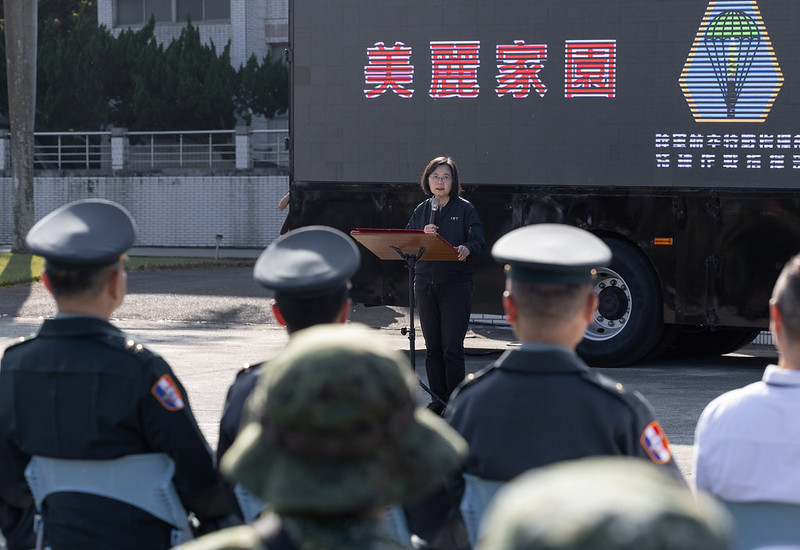 蔡英文總統今(15)日上午前往臺中勗勉「特四營戰術任務訓練」,肯定特四營以高昂的士氣、機敏的應變能力,一一完成各項任務,展現紮實的訓練成效與特戰部隊勇猛剽悍的精神。她期許大家在快速變動的局勢中,可以迅速調整訓練內容,精進訓練及整備效益,並感謝現場的家屬、親朋好友當後盾,讓國軍弟兄姊妹在辛勞的時刻,獲得家人的溫暖,繼續為守護國家來努力。