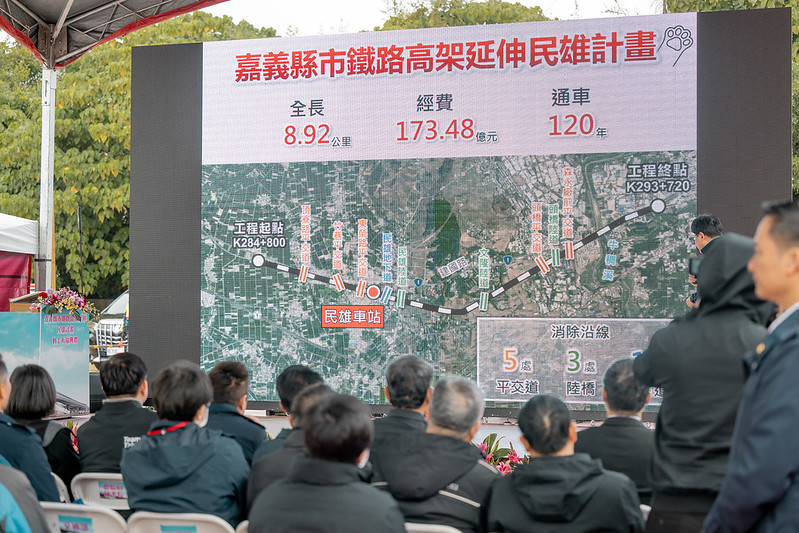 總統強調,未來鐵路高架化完工後,將可消除民雄鄉平面道路上的5處平交道、3座陸橋以及1處地下道,改善交通瓶頸,保障鄉親通勤安全。同時,騰出的橋下空間也將串接成為景觀廊道,改善鐵路沿線居民生活品質。更重要的是,鐵路高架化之後,可以縫合原本鐵道行經的兩側土地,讓民雄火車站前後站能夠全面、均衡發展。