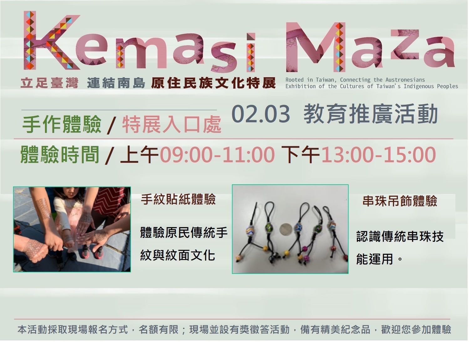原民會文化發展中心也將於「Kemasi Maza立足台灣,連結南島特展」展區入口處,舉辦教育推廣活動,歡迎大小朋友一同參與體驗。