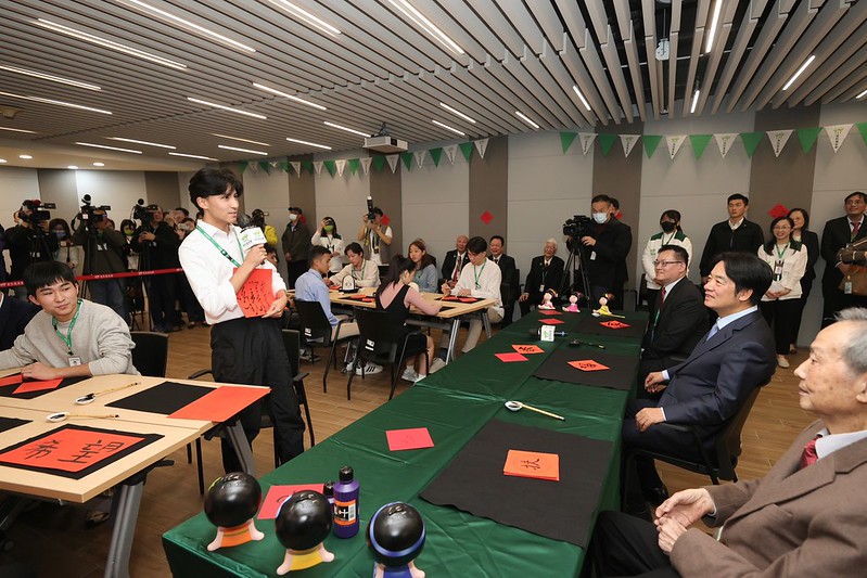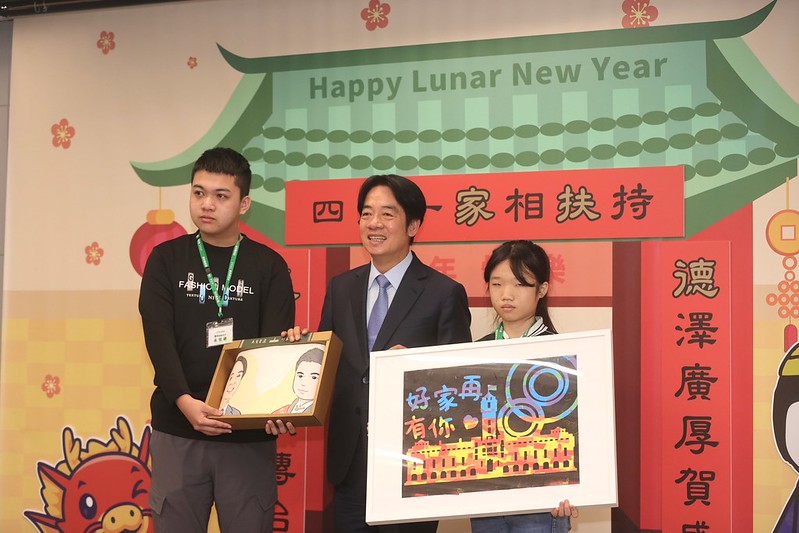 隨後,副總統與現場國際學生代表一同書寫春聯,進行文化交流,並接受家扶基金會「2023全國自強兒少表揚活動」兩位兒少代表贈禮。