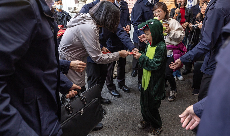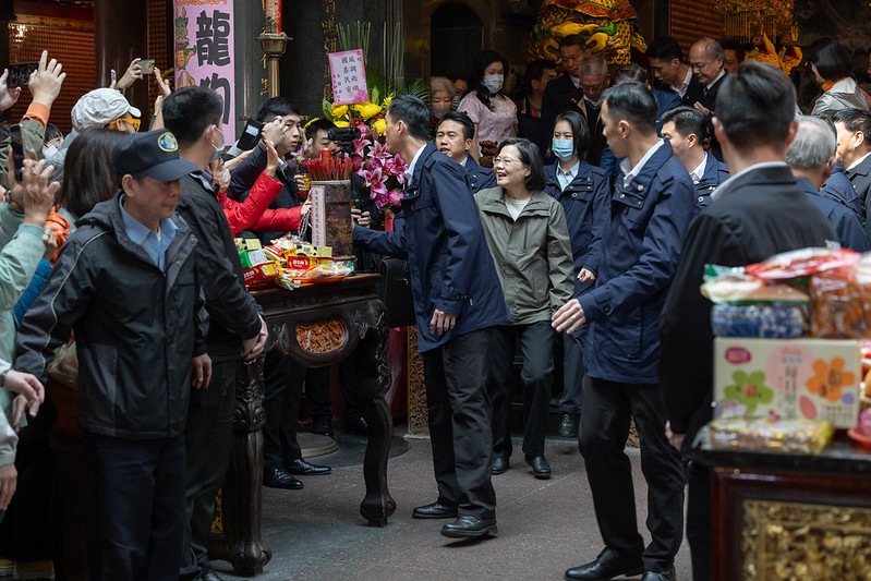 隨後,總統前往臺北市「北投關渡宮」、嘉義縣「大林安霞宮」及嘉義市「天后宮」祈福參香,祝願臺灣風調雨順、國泰民安,並於天后宮參拜時,致贈「厚德敦化」匾額。總統也親自發送龍年新春福袋向在地鄉親問候拜年,眾多民眾排隊領取,期盼從總統手中取得吉祥好兆頭。