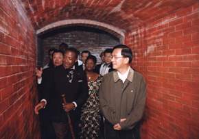陳總統上午首先陪同賴比瑞亞泰勒總統到鶯歌陶瓷博物館,並在吳進風館長的引導介紹下,一起通過「之門」,並參觀一、二樓常設展區精緻的展品,吳館長為表示對國賓的歡迎之意,特致贈由陶藝家邱煥堂所創作的「禧門」,該作品旨在將彩虹與拱門的形狀融合在雕塑中,象徵人類難以捉摸,卻可實現的夢想|物質與精神均衡的美好生活。隨之,兩國元首並在台北縣蘇貞昌縣長的陪同下,前往陶瓷老街參觀,受到民眾熱情的歡迎。