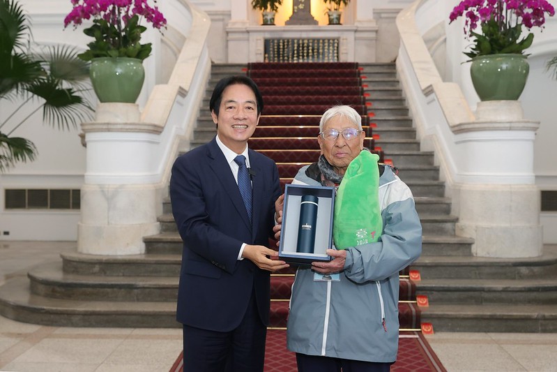 隨後,副總統致贈臺灣抱枕,由郭深森先生代表接受;也在郭深森先生衣服背面貼上「我100歲,環島中」大貼紙;副總統並與不老騎士一同至府前階梯大合影,充滿活力齊呼口號「2024不老騎士為愛千里」,現場氣氛十分熱鬧。