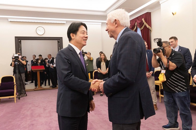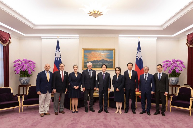 訪賓一行由副總統當選人蕭美琴、外交部長吳釗燮、美國在台協會台北辦事處處長孫曉雅(Sandra Oudkirk)陪同,前來總統府拜會副總統,國家安全會議副秘書長徐斯儉也在座。