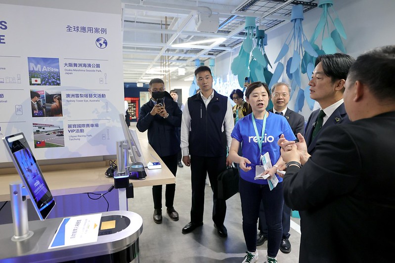 副總統抵達後,在KKday創辦人暨執行長陳明明引導下,參觀該公司開放辦公區域,並體驗「rezio數位購票及電子閘門入園」,實地了解旅遊業者科技轉型的具體成果。